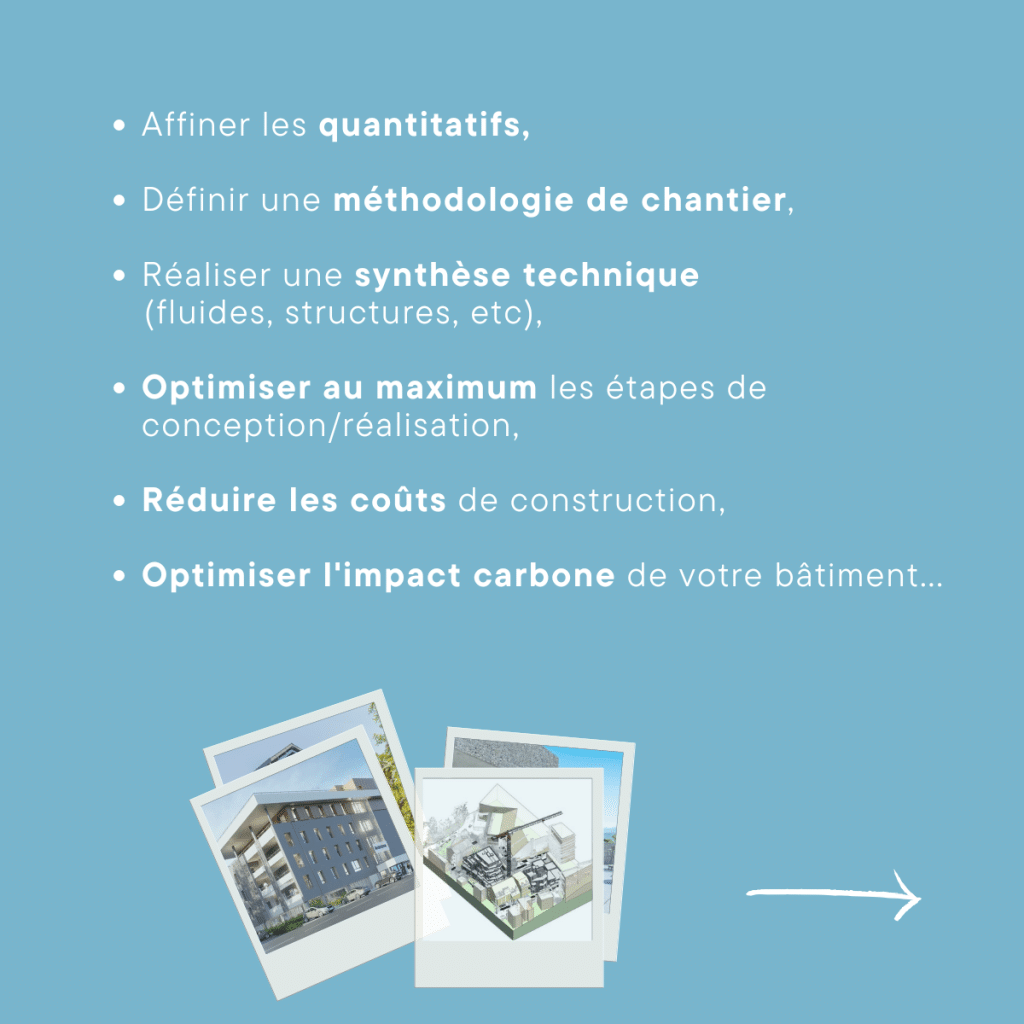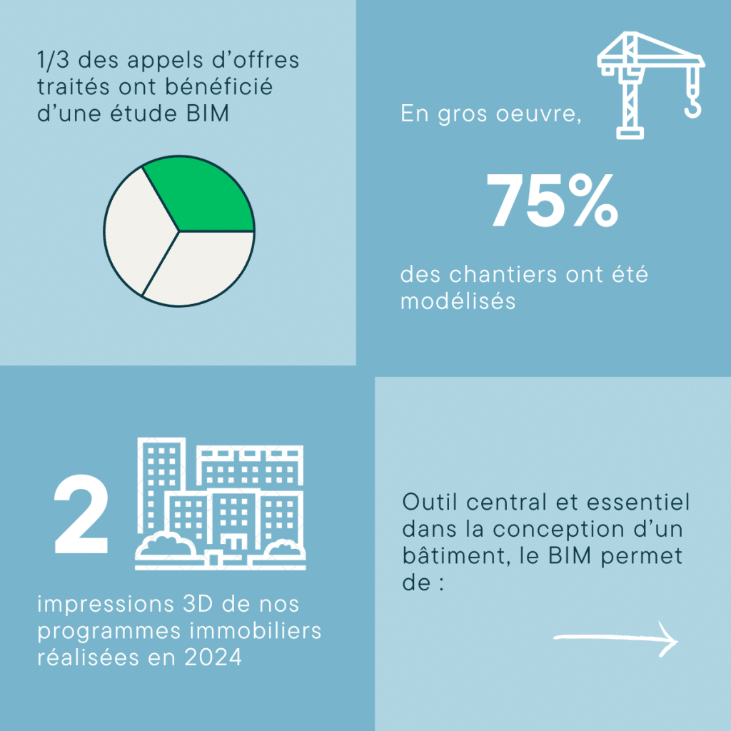 L’intégration du processus BIM dès la conception du projet permet de réaliser un jumeau numérique du projet, c’est-à-dire réaliser le projet de façon numérique, avant le chantier. Cela permet d’avoir un premier aperçu du projet, tel qu’il sera réalisé, avant même que la moindre construction soit commencée. Il est donc possible de concevoir au mieux des bâtiments performants et ergonomiques, tout en limitant les aléas lors de sa réalisation.