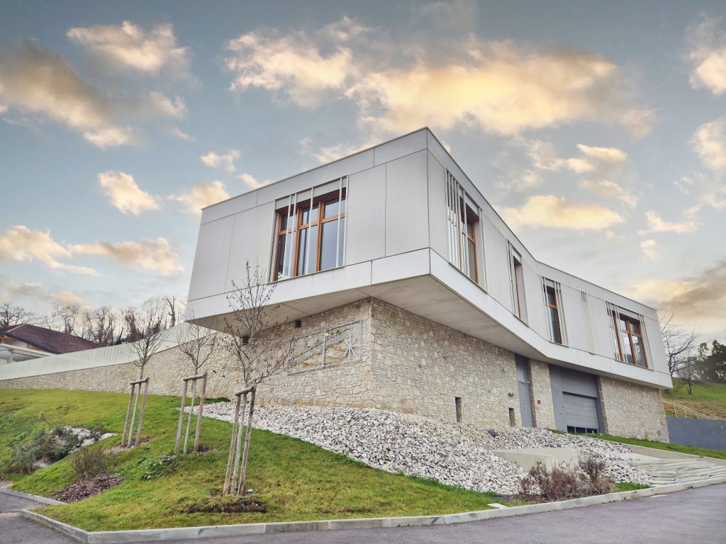 Réalisation d’un restaurant scolaire et accueil périscolaire sur un terrain pentu au cœur du village d’Allonzier-La-Caille.